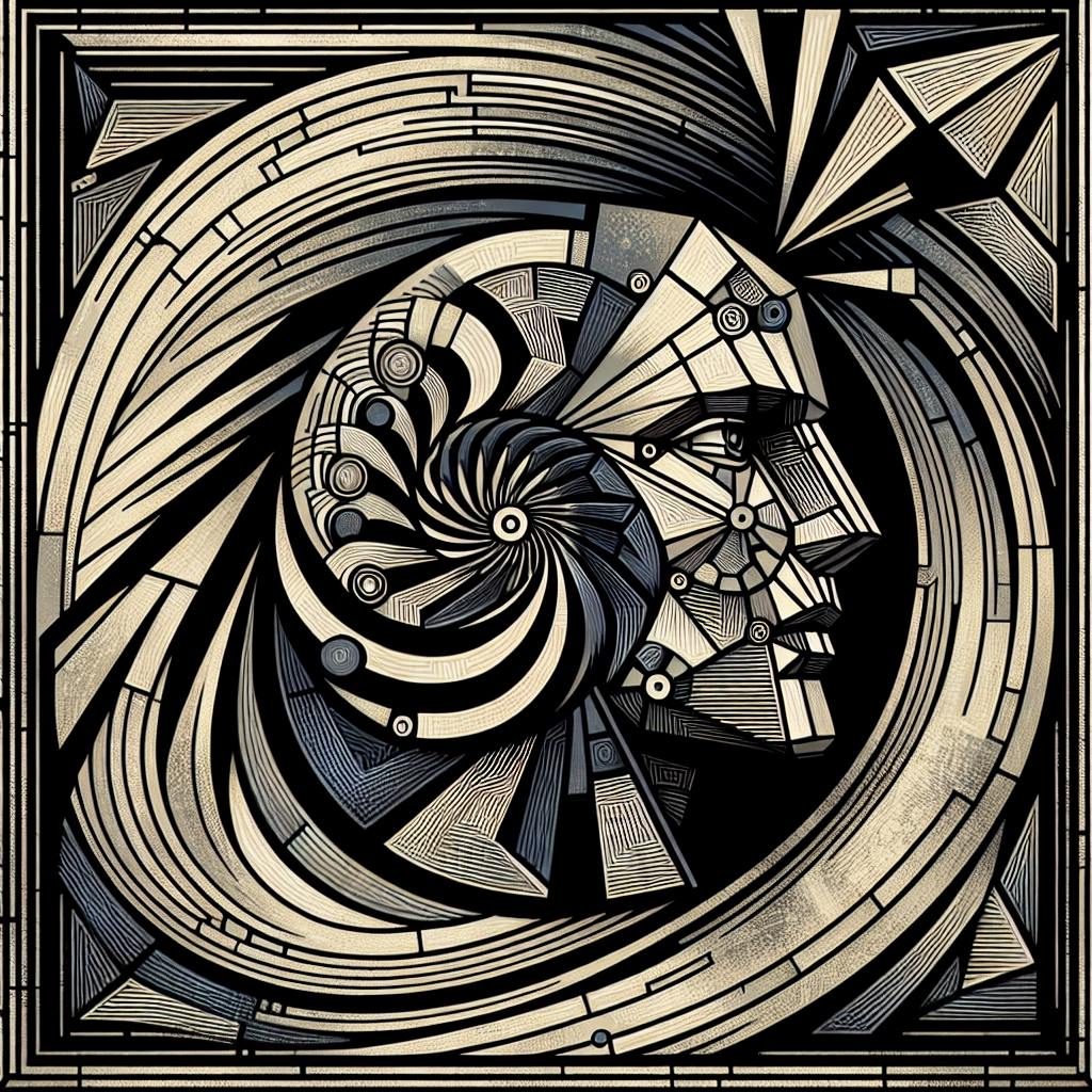 This artwork is created in the Vorticism style, showcasing a black and white drawing of a horse in a circular frame with influences from Vorticism art techniques.