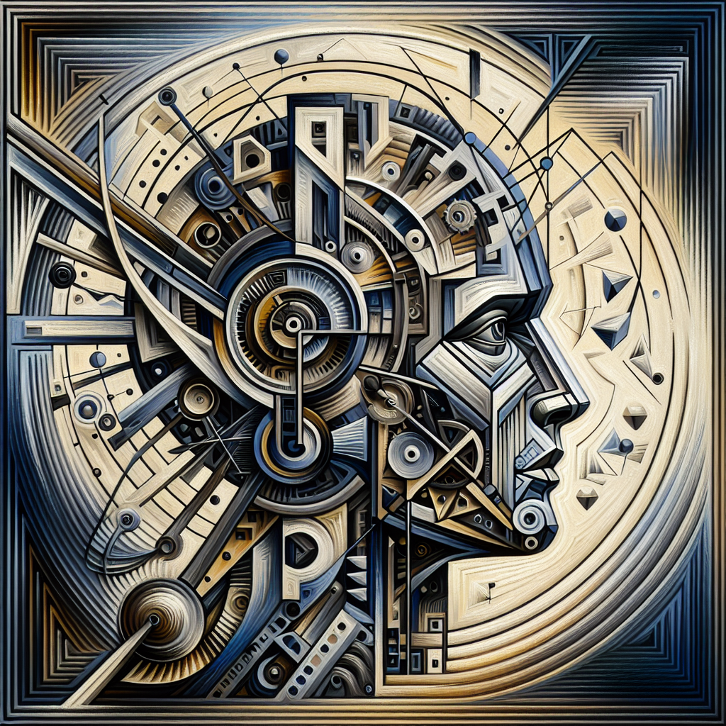 This artwork is created in the Vorticism style, showcasing a painting of a clock with gears and gears with influences from Vorticism art techniques.