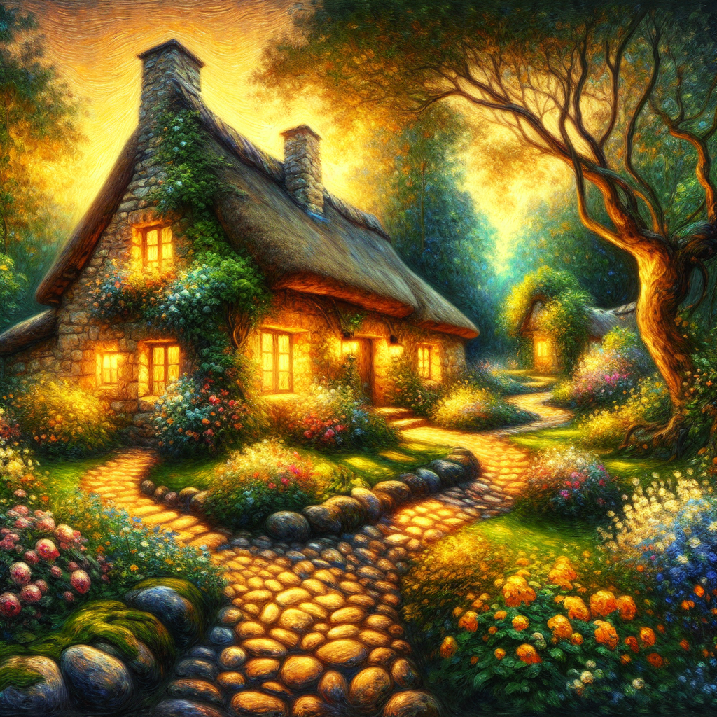 This artwork is created in the Impressionism style, showcasing a painting of a cottage in the woods with influences from Impressionism art techniques.