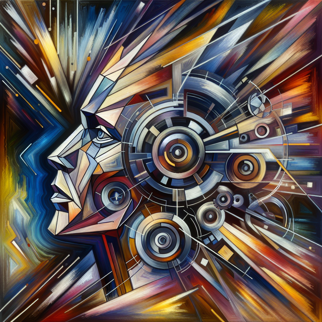 This artwork is created in the Vorticism style, showcasing a painting of a face with many different shapes with influences from Vorticism art techniques.