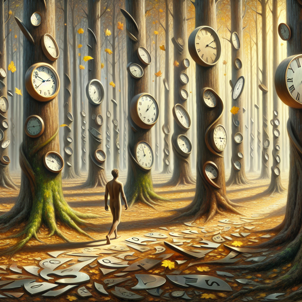 This artwork is created in the Surrealism style, showcasing a painting of a forest with clocks with influences from Surrealism art techniques.