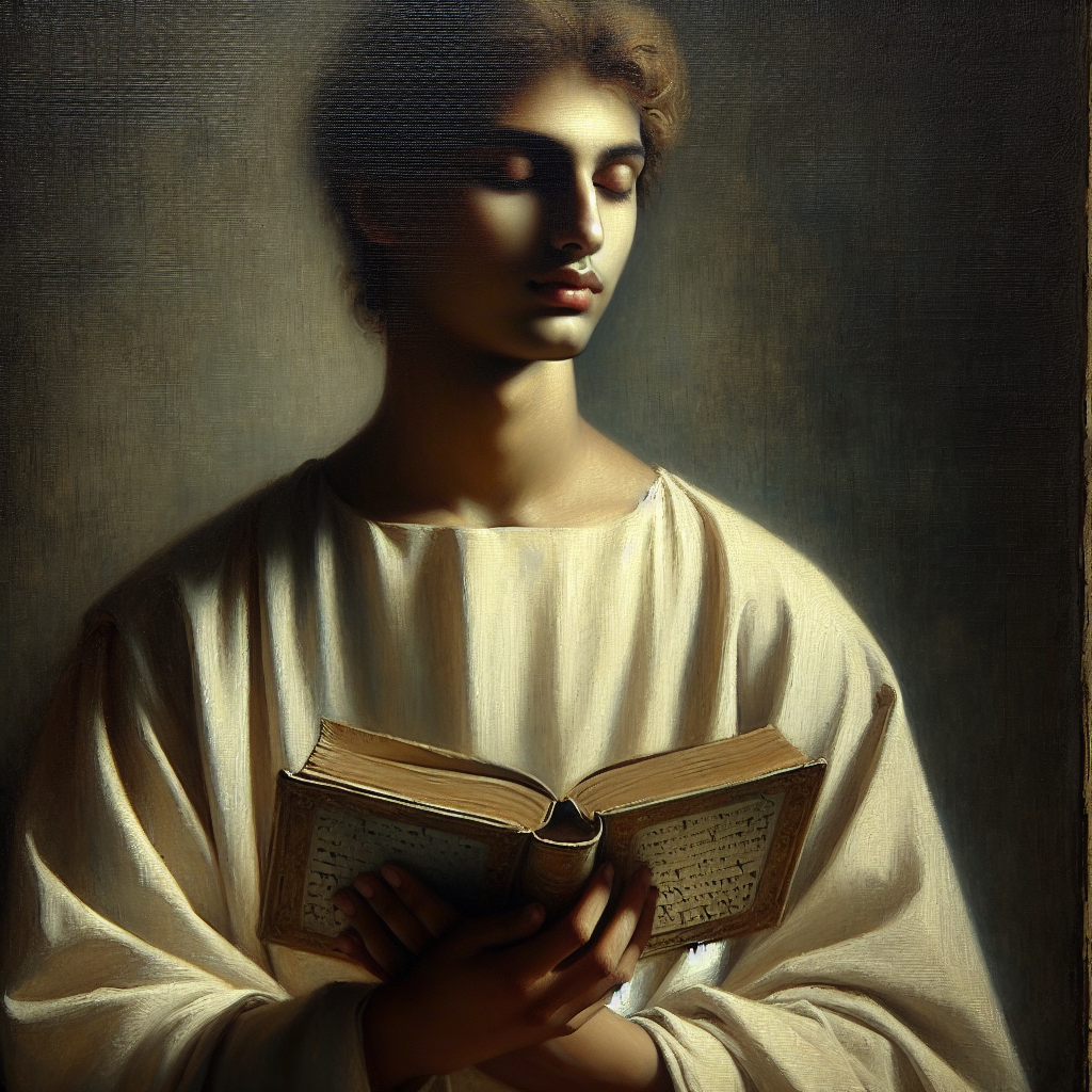 A painting of a woman holding a book