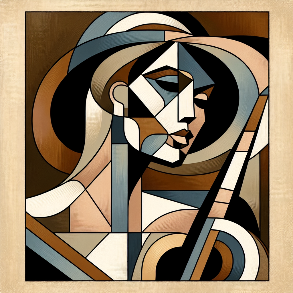 This artwork is created in the Cubism style, showcasing a painting of a man playing a guitar with influences from Cubism art techniques.