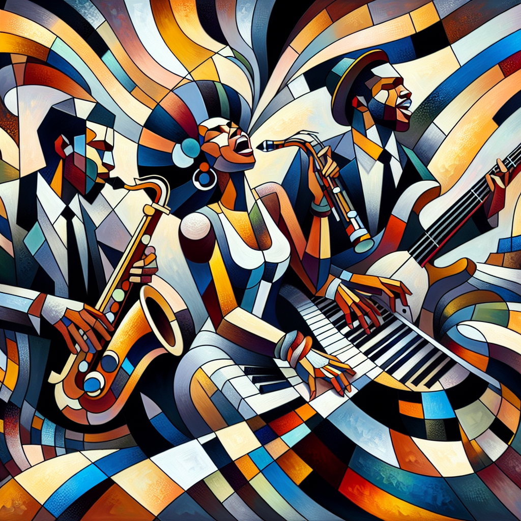 This artwork is created in the Abstract expressionism style, showcasing jazz jazz jazz music abstract background with jazz musicians illustration with influences from Abstract expressionism art techniques.