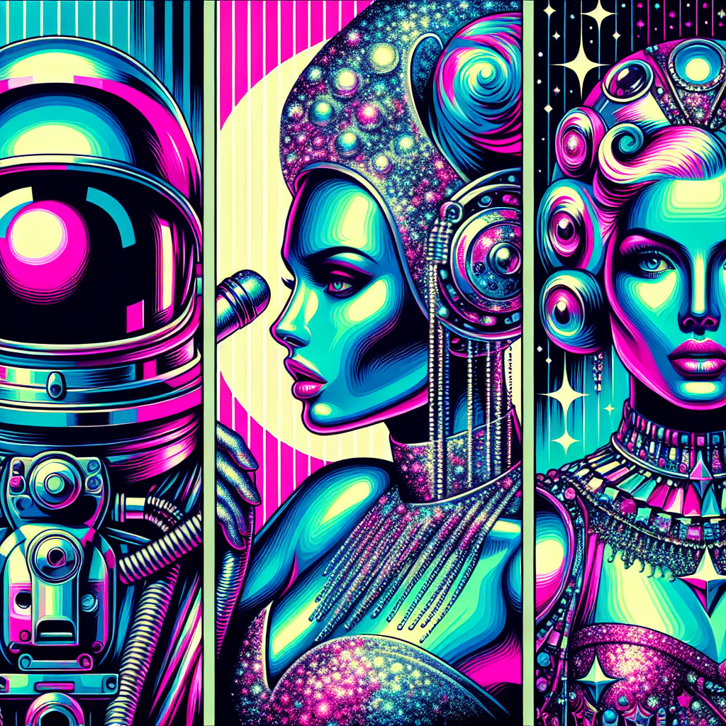 This artwork is created in the Pop art style, showcasing three robots and a woman in a space suit with influences from Pop art art techniques.